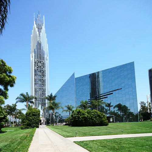 Second, what of the evangelical community? I challenge you to find me a beautiful mega-church. It's not that the size of those churches that prohibits beautiful architecture. It's also the theology of those churches. Can you imagine Joel Osteen's vision of a beautiful church? It'd be a mix of florescent lights and video screens with an alter at every exit to the almighty dollar. We've already seen one mega-pastor's vision (which probably didn't include bankruptcy...) and it wrought upon us the Crystal Cathedral, a cavernous and angular mess without a face and with poor proportions. More fitting for the set of Superman 2 than for Southern California.