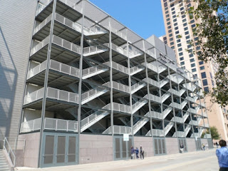 That's bad enough, but just wait until you see the back. I don't know what the hell is going on here, but it's just a clusterfuck of stairs. I don't think I've ever seen anything like this. The poor design results in an eyesore that can be seen from the neighboring restaurants who, despite the probable benefit of being next to the convention center, have to deal with the worst view in Austin.