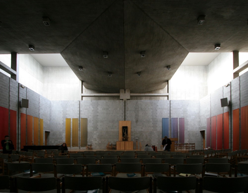 See, for example, Louis Kahn's First Unitary Church. The imposing ceiling with remotely controlled turrets. The rectangles of color to give life to the dull interior. What does this building say about God, and what does this building say about Christianity? Nothing good, that's what.
